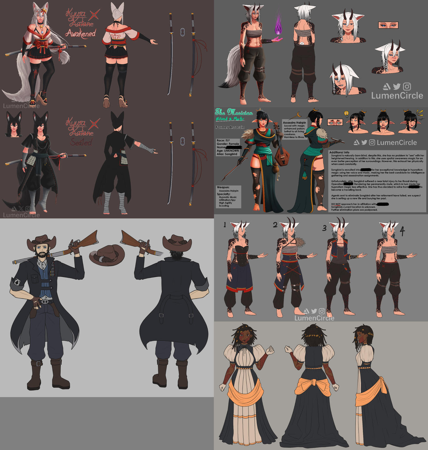 The artist would like to give these works ample time for polish and adjustments in case of things going awry.*Base price character sheet includes a rendered front view, flat colored back view and three flat colored facial expressions.